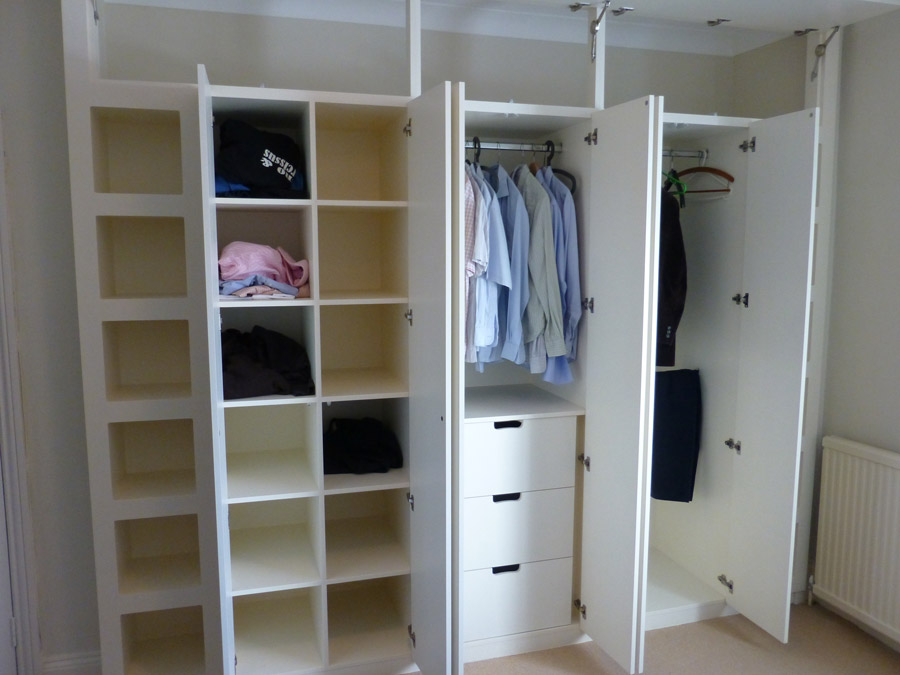 This wardrobe has sleek flush doors on concealed hinges with pressure catches. The upper doors are lift up, for easier access (and no bruised heads).